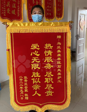 近日,烏蘭美康養(yǎng)院收到了一封致謝院內(nèi)全體工作人員的感謝信和一面送給石鳳英護(hù)理員的錦旗,錦旗上面寫著“熱心服務(wù),盡職盡責(zé),愛心無限,勝似親人”。一句感謝的話語,一面肯定的錦旗都承載了老人家屬對(duì)我們服務(wù)的認(rèn)可,讓我們更有一種責(zé)任感和使命感要把這份工作做好。
